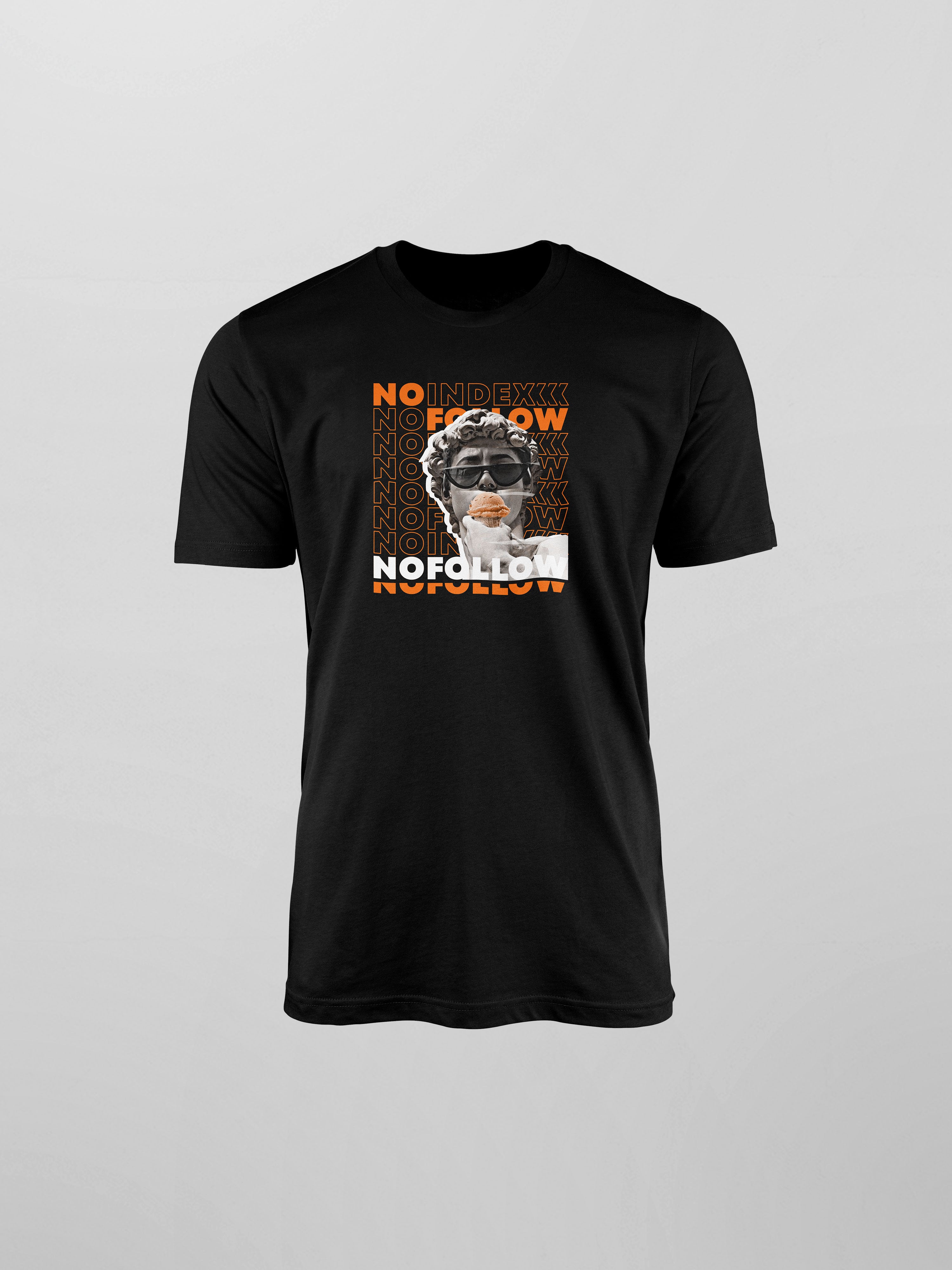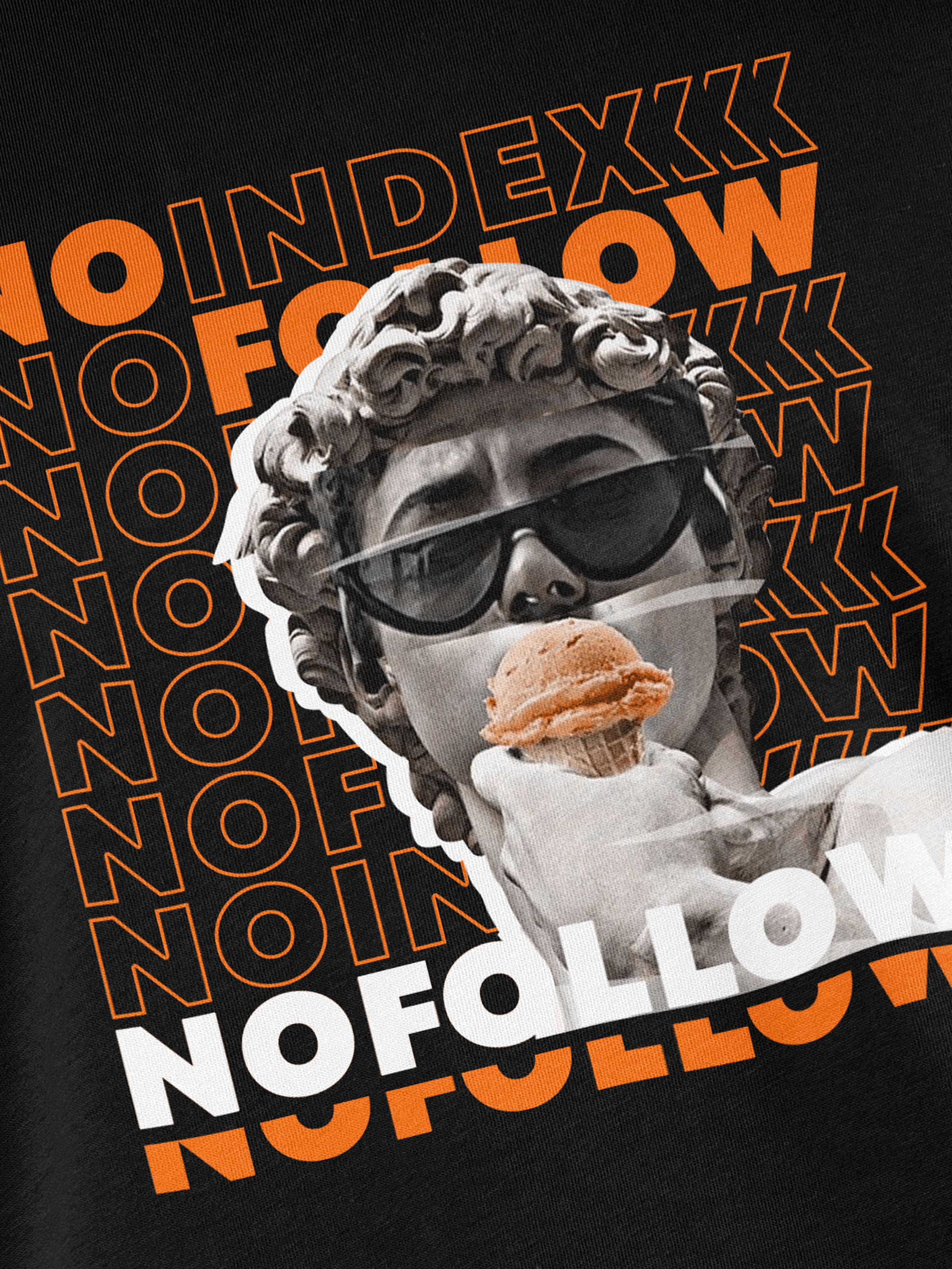 Continuando con su diseño único, el Polo 'No Index No Follow' de ByPhantoms se destaca con su paleta en blanco y negro, donde los textos y elementos en naranja añaden un toque de vitalidad. La imagen de Miguel Ángel, reinventada con lentes oscuros, aporta un aire contemporáneo al clásico, mientras el helado naranja en su mano simboliza la fusión de lo atemporal con lo moderno. El patrón de fondo con la frase 'No Index No Follow' se repite, creando un lienzo que representa la decisión de ser visible a nuestra propia manera en un mundo saturado de información.